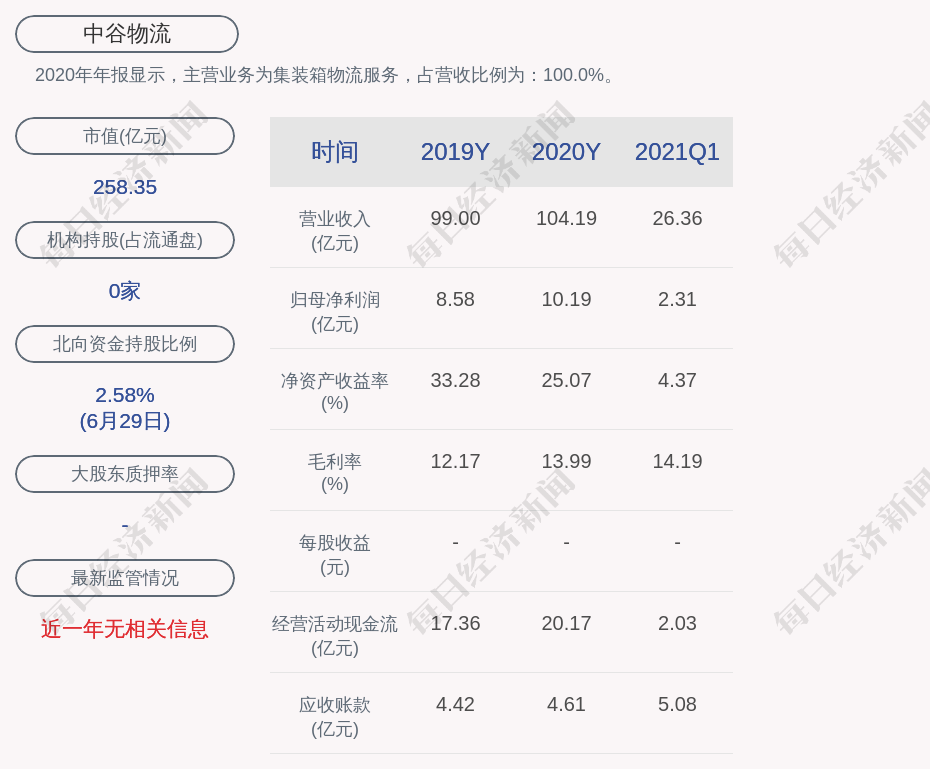 2020年年报显示,中谷物流的主营业务为集装箱物流服务,占营收比例为:100.0%。