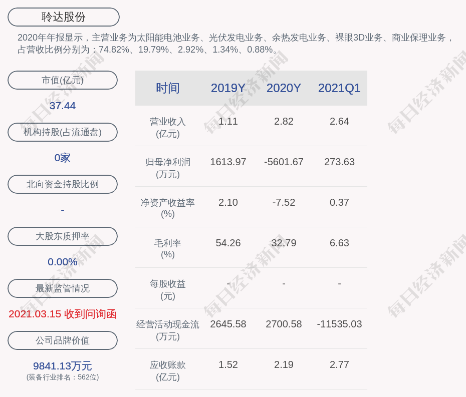 2020年年报显示,聆达股份的主营业务为太阳能电池业务、光伏发电业务、余热发电业务、裸眼3D业务、商业保理业务,占营收比例分别为:74.82%、19.79%、2.92%、1.34%、0.88%。