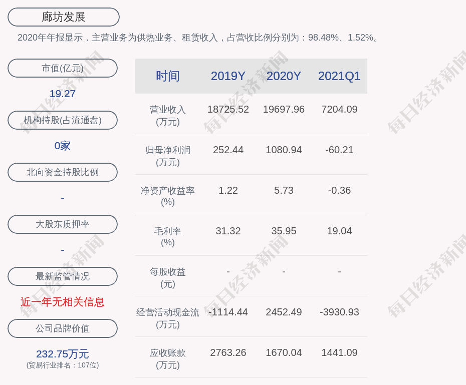 2020年年报显示,廊坊发展的主营业务为供热业务、租赁收入,占营收比例分别为:98.48%、1.52%。