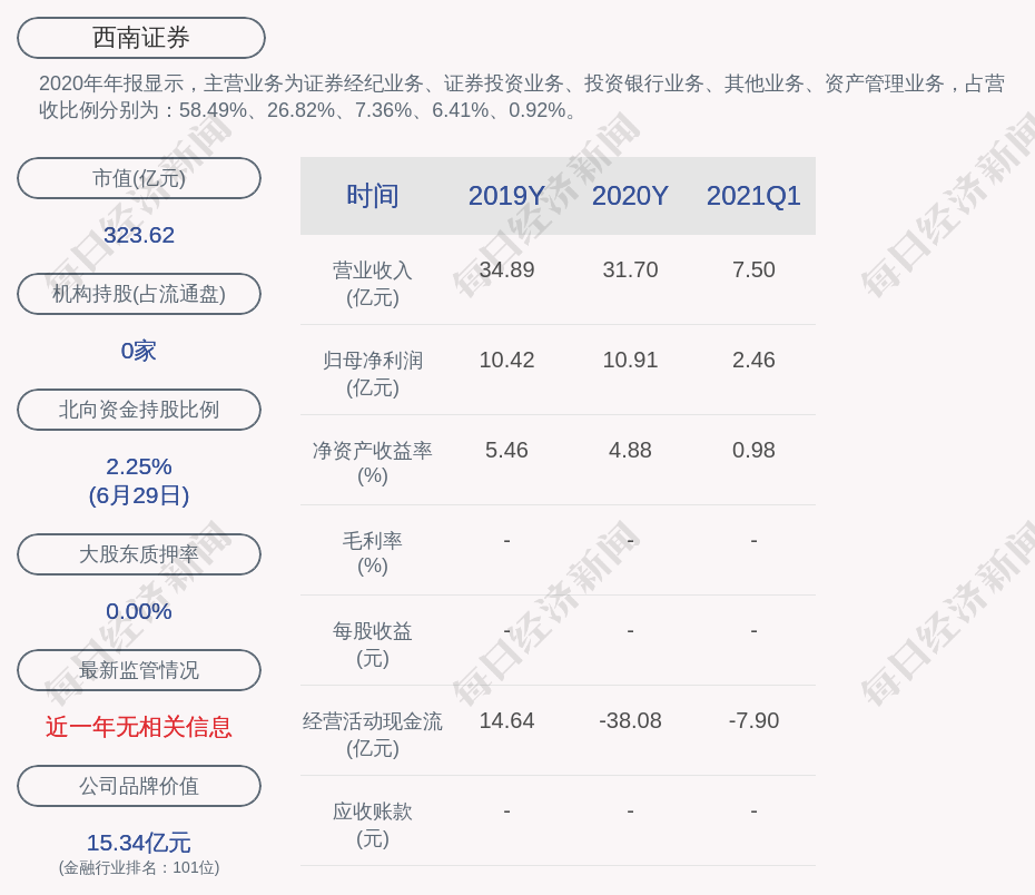 2020年年报显示,西南证券的主营业务为证券经纪业务、证券投资业务、投资银行业务、资产管理业务等。