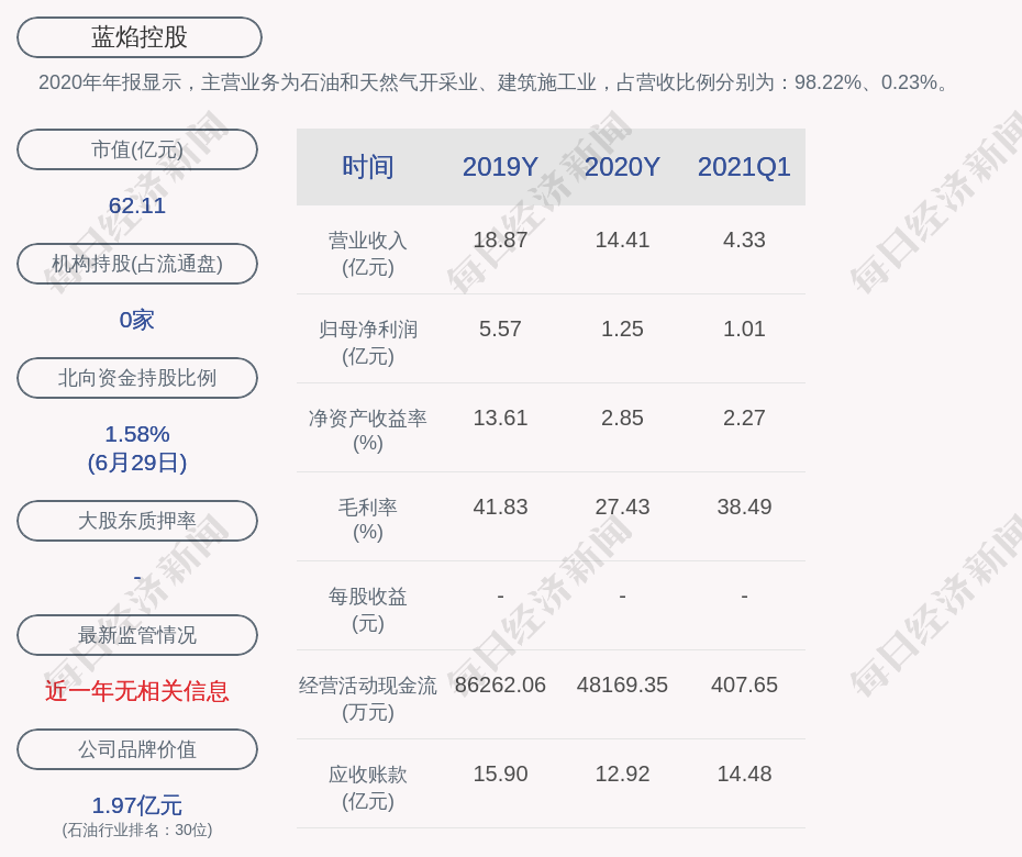 2020年年报显示,蓝焰控股的主营业务为石油和天然气开采业、建筑施工业,占营收比例分别为:98.22%、0.23%。