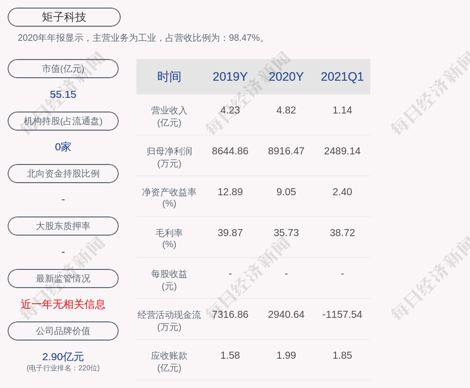2020年年报显示,矩子科技的主营业务为工业,占营收比例为:98.47%。