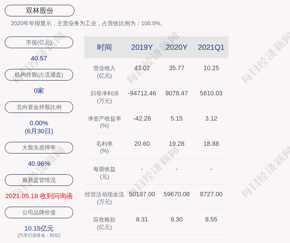 2020年年报显示,双林股份的主营业务为工业,占营收比例为:100.0%。