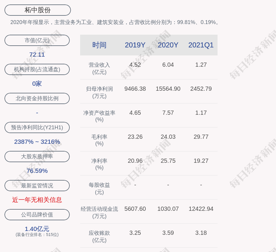 2020年年报显示,柘中股份的主营业务为工业、建筑安装业,占营收比例分别为:99.81%、0.19%。