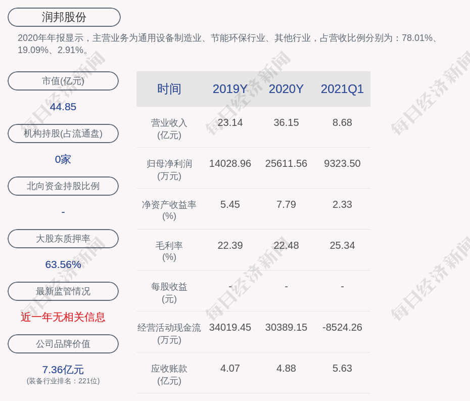 2020年年报显示,润邦股份的主营业务为通用设备制造业、节能环保行业、其他行业,占营收比例分别为:78.01%、19.09%、2.91%。