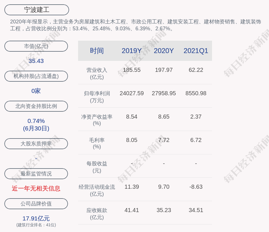 2020年年报显示,宁波建工的主营业务为房屋建筑和土木工程、市政公用工程、建筑安装工程、建材物资销售、建筑装饰工程,占营收比例分别为:53.4%、25.48%、9.03%、6.39%、2.67%。