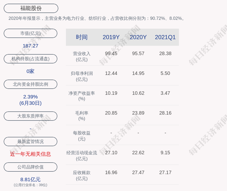 2020年年报显示,福能股份的主营业务为电力行业、纺织行业,占营收比例分别为:90.72%、8.02%。