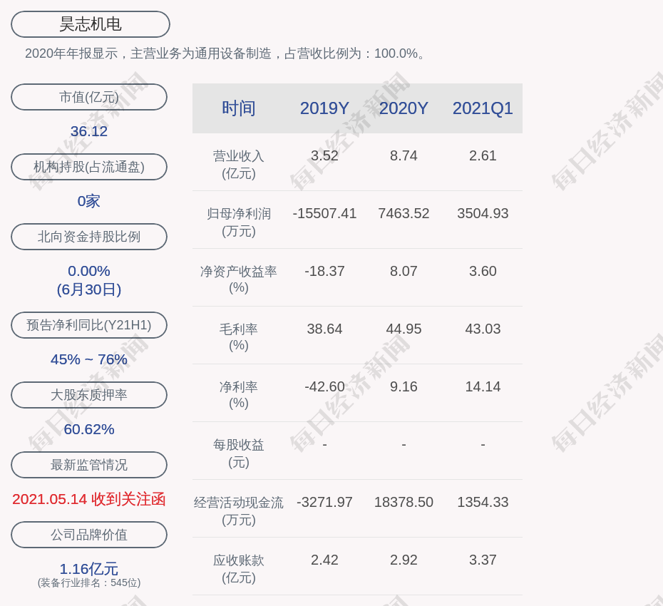 2020年年报显示,昊志机电的主营业务为通用设备制造,占营收比例为:100.0%。