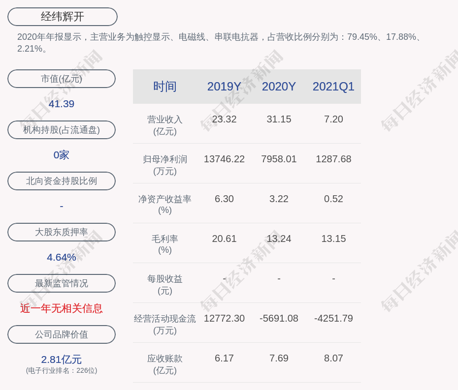 2020年年报显示,经纬辉开的主营业务为触控显示、电磁线、串联电抗器,占营收比例分别为:79.45%、17.88%、2.21%。