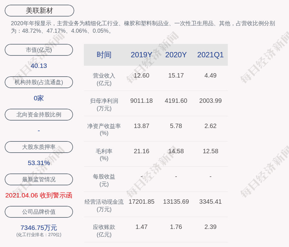 2020年年报显示,美联新材的主营业务为精细化工行业、橡胶和塑料制品业、一次性卫生用品、其他,占营收比例分别为:48.72%、47.17%、4.06%、0.05%。