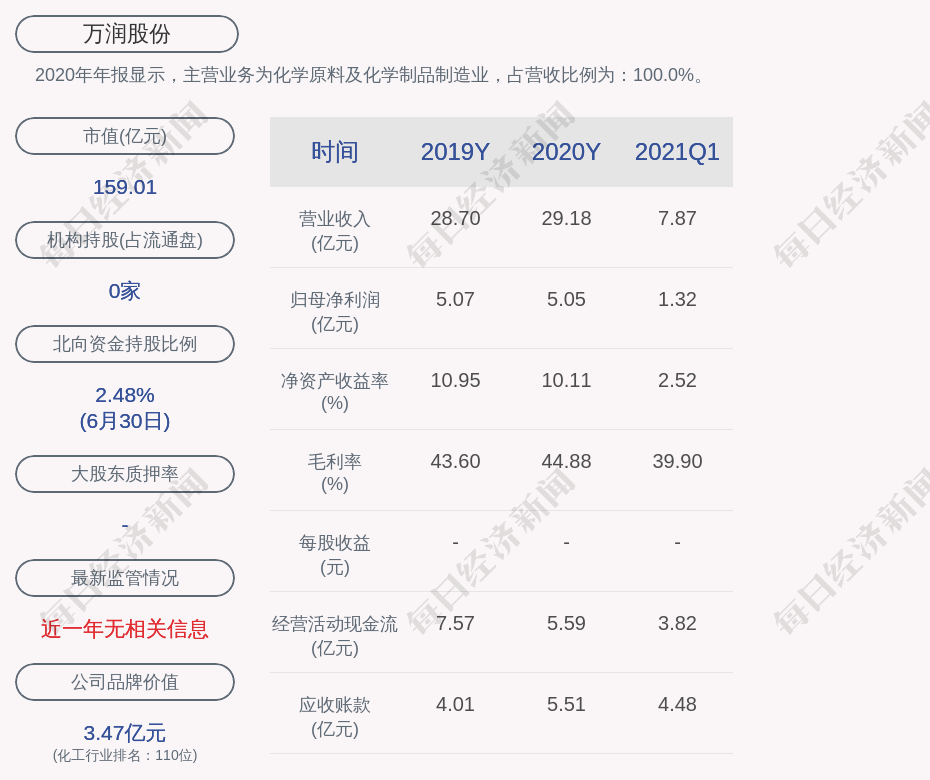 2020年年报显示,万润股份的主营业务为化学原料及化学制品制造业,占营收比例为:100.0%。
