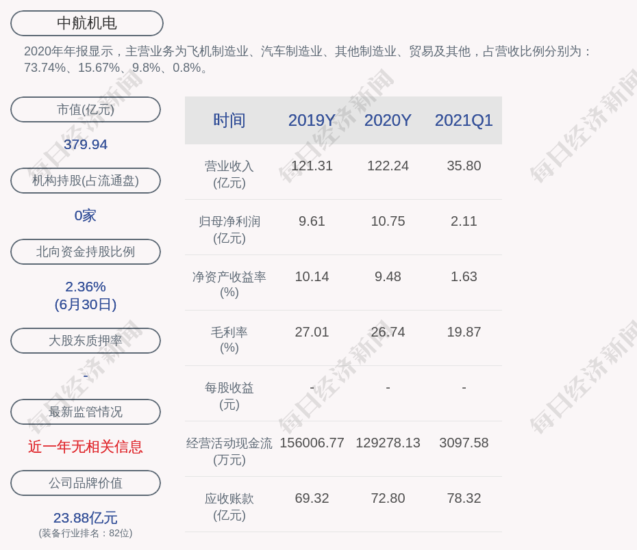 2020年年报显示,中航机电的主营业务为飞机制造业、汽车制造业、其他制造业、贸易及其他,占营收比例分别为:73.74%、15.67%、9.8%、0.8%。