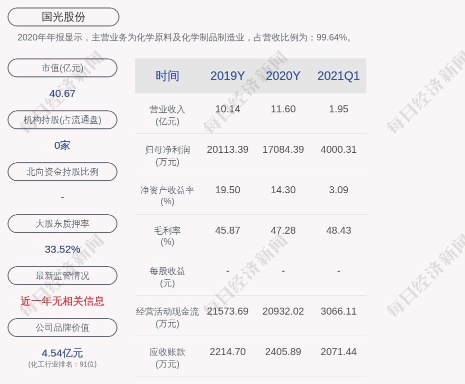 2020年年报显示,国光股份的主营业务为化学原料及化学制品制造业,占营收比例为:99.64%。