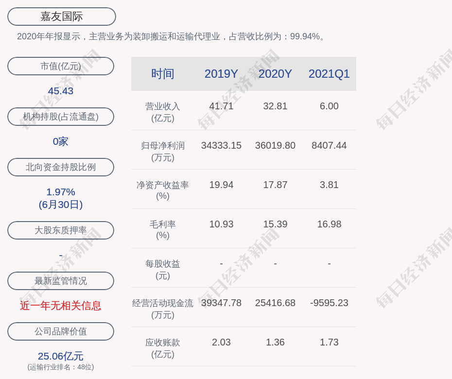 2020年年报显示,嘉友国际的主营业务为装卸搬运和运输代理业,占营收比例为:99.94%。