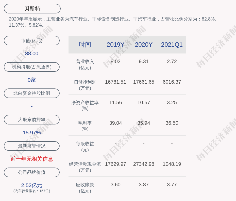 2020年年报显示,贝斯特的主营业务为汽车行业、非标设备制造行业、非汽车行业,占营收比例分别为:82.8%、11.37%、5.82%。