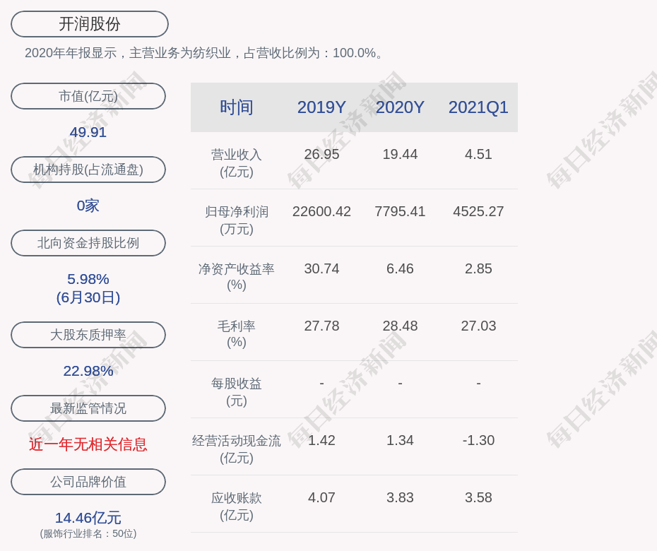 2020年年报显示,开润股份的主营业务为纺织业,占营收比例为:100.0%。