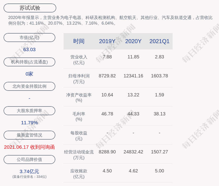 2020年年报显示,苏试试验的主营业务为电子电器、科研及检测机构、航空航天、其他行业、汽车及轨道交通,占营收比例分别为:41.16%、20.07%、13.22%、7.16%、6.04%。