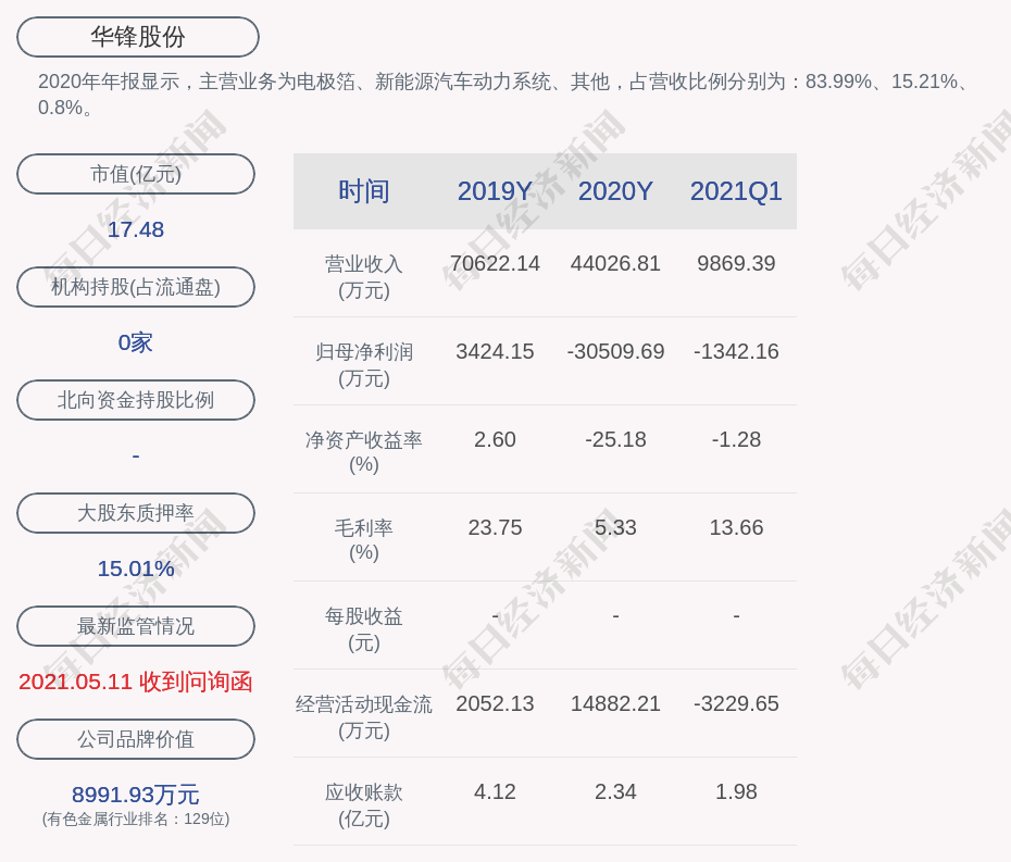 2020年年报显示,华锋股份的主营业务为电极箔、新能源汽车动力系统、其他,占营收比例分别为:83.99%、15.21%、0.8%。