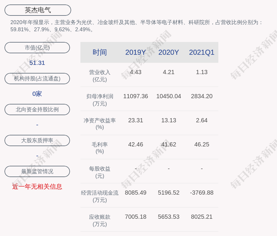 2020年年报显示,英杰电气的主营业务为光伏、冶金玻纤及其他、半导体等电子材料。