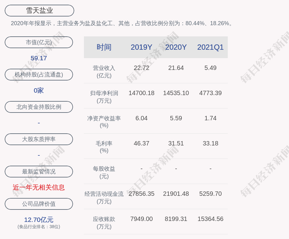2020年年报显示,雪天盐业的主营业务为盐及盐化工、其他,占营收比例分别为:80.44%、18.26%。