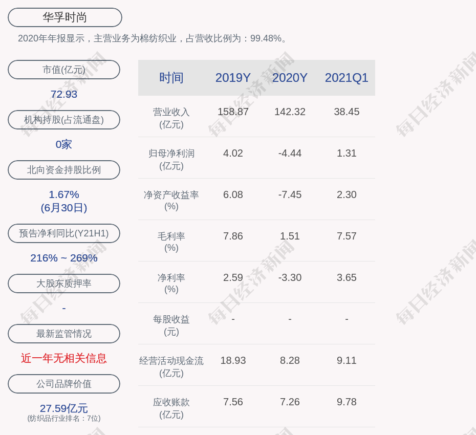 2020年年报显示,华孚时尚的主营业务为棉纺织业,占营收比例为:99.48%。