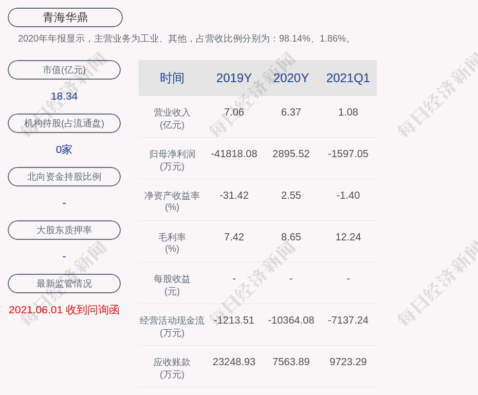 2020年年报显示,青海华鼎的主营业务为工业、其他,占营收比例分别为:98.14%、1.86%。