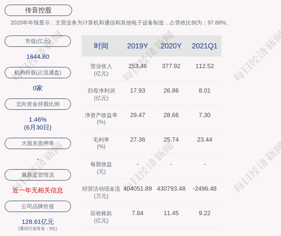 2020年年报显示,传音控股的主营业务为计算机和通信和其他电子设备制造,占营收比例为:97.88%。