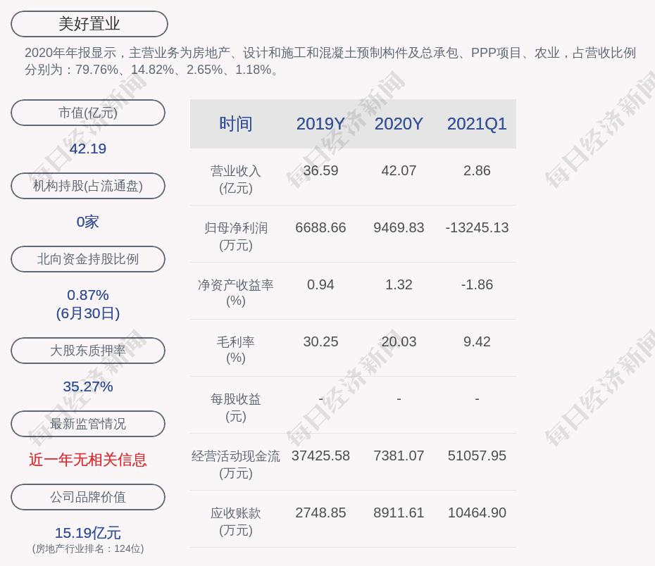 2020年年报显示,美好置业的主营业务为房地产、设计和施工和混凝土预制构件及总承包、PPP项目、农业,占营收比例分别为:79.76%、14.82%、2.65%、1.18%。