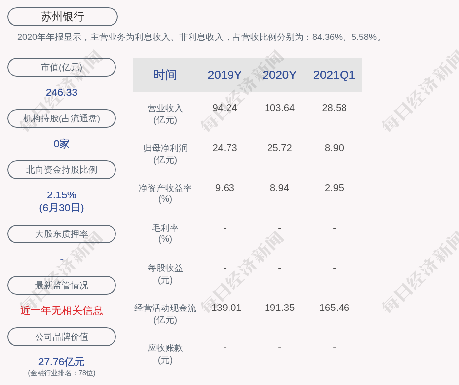 2020年年报显示,苏州银行的主营业务为利息收入、非利息收入,占营收比例分别为:84.36%、5.58%。