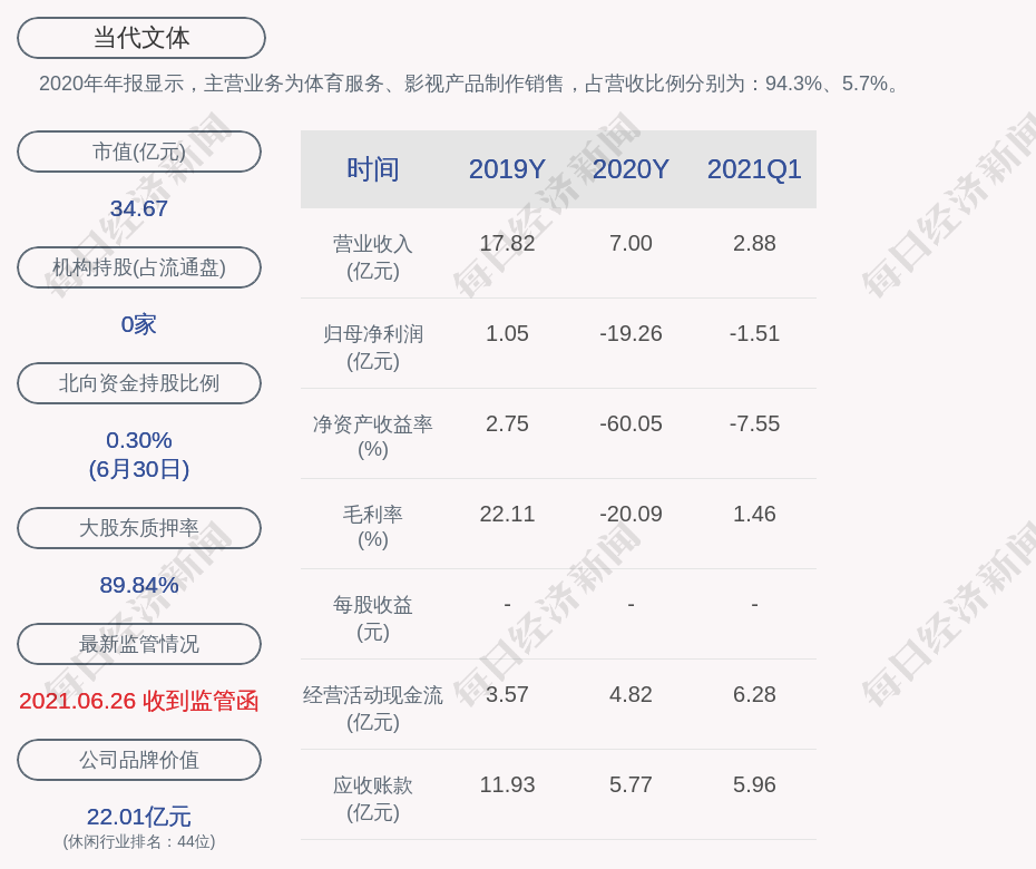 2020年年报显示,当代文体的主营业务为体育服务、影视产品制作销售,占营收比例分别为:94.3%、5.7%。