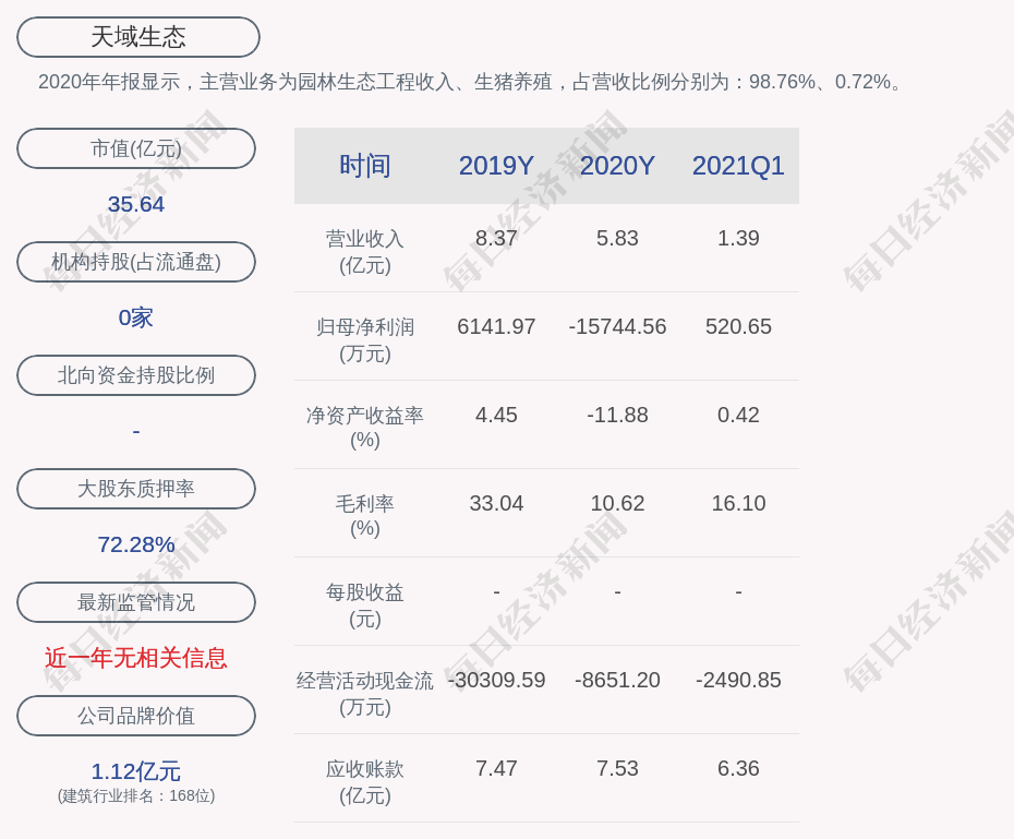 2020年年报显示,天域生态的主营业务为园林生态工程收入、生猪养殖,占营收比例分别为:98.76%、0.72%。