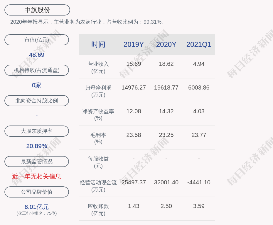 2020年年报显示,中旗股份的主营业务为农药行业。