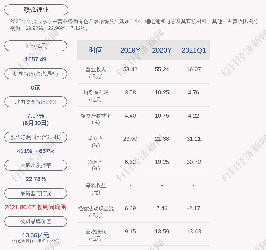 2020年年报显示,赣锋锂业的主营业务为有色金属冶炼及压延加工业、锂电池和电芯及其直接材料、其他,占营收比例分别为:69.92%、22.96%、7.12%。