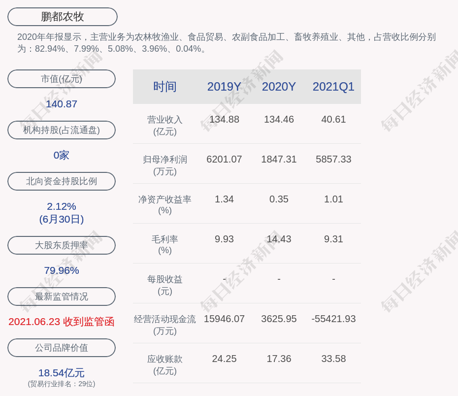 2020年年报显示,鹏都农牧的主营业务为农林牧渔业、食品贸易、农副食品加工、畜牧养殖业等。