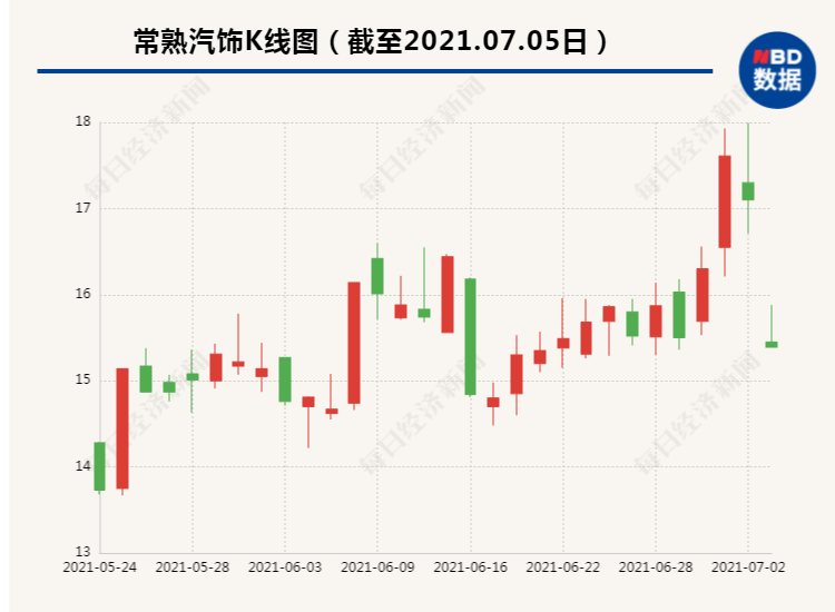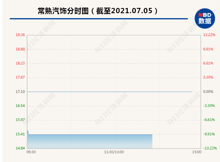 7月5日,常熟汽饰(603035,SH)在上个交易日跌2.9%的基础上一字跌停,截至发稿,该股报15.39元,跌10%跌停,封单高达10.4万手,成交1.73亿元,最新市值为55.27亿元。