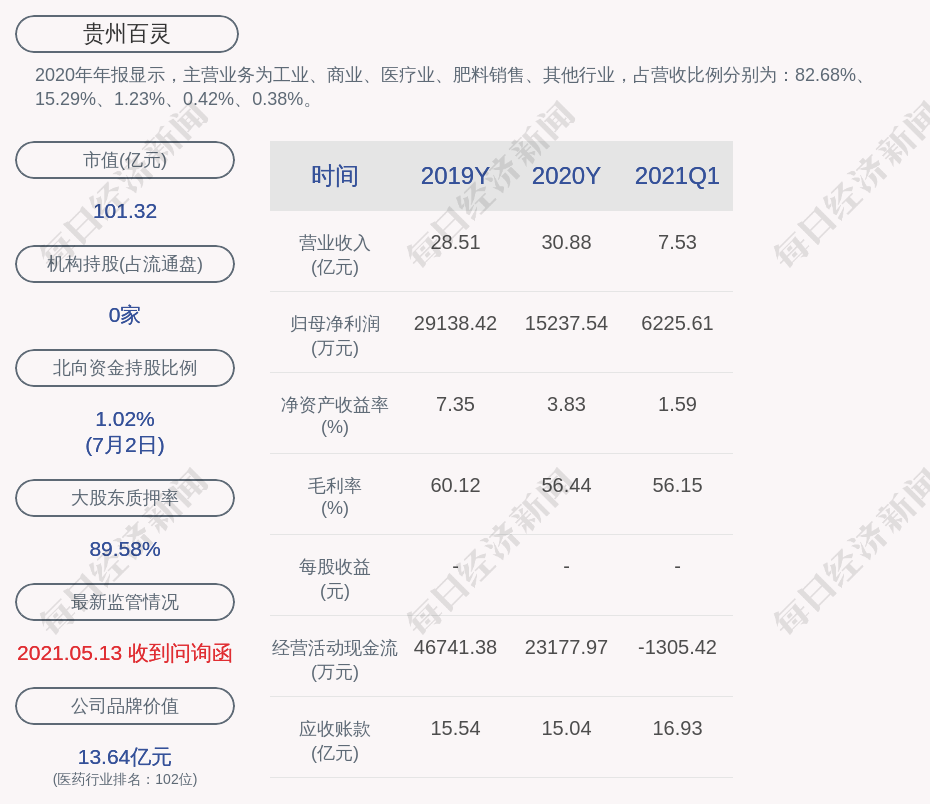 2020年年报显示,贵州百灵的主营业务为工业、商业、医疗业、肥料销售、其他行业,占营收比例分别为:82.68%、15.29%、1.23%、0.42%、0.38%。