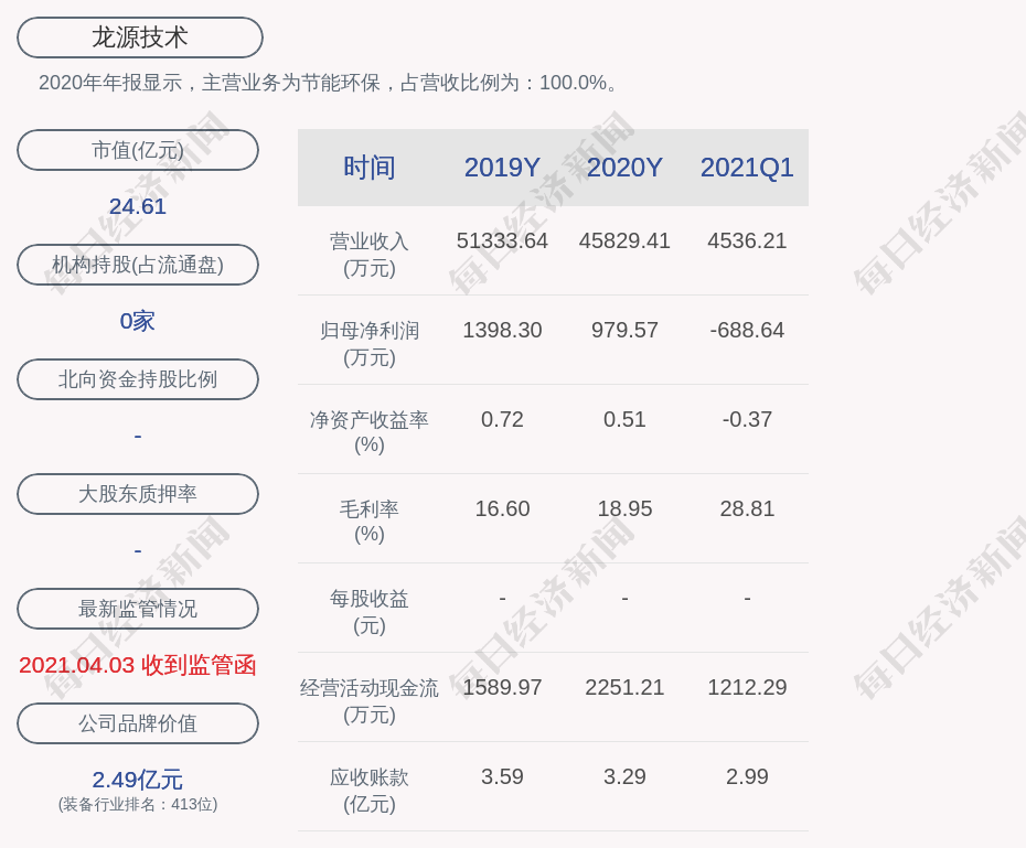 2020年年报显示,龙源技术的主营业务为节能环保,占营收比例为:100.0%。