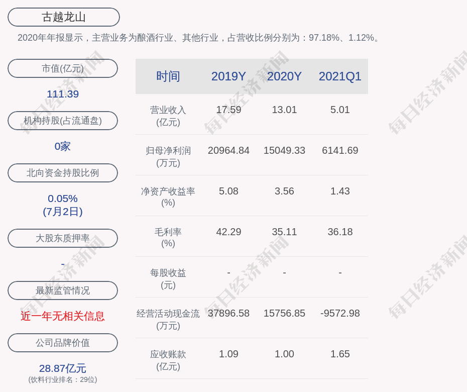 2020年年报显示,古越龙山的主营业务为酿酒行业、其他行业,占营收比例分别为:97.18%、1.12%。