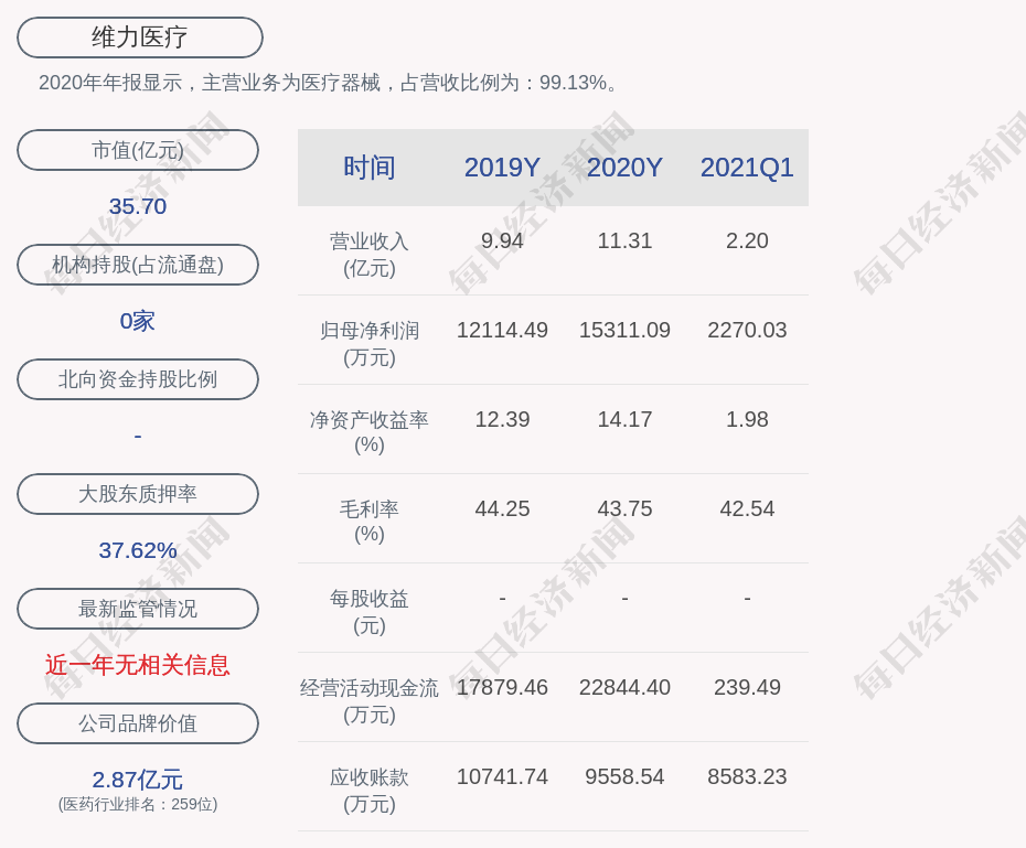 2020年年报显示,维力医疗的主营业务为医疗器械,占营收比例为:99.13%。