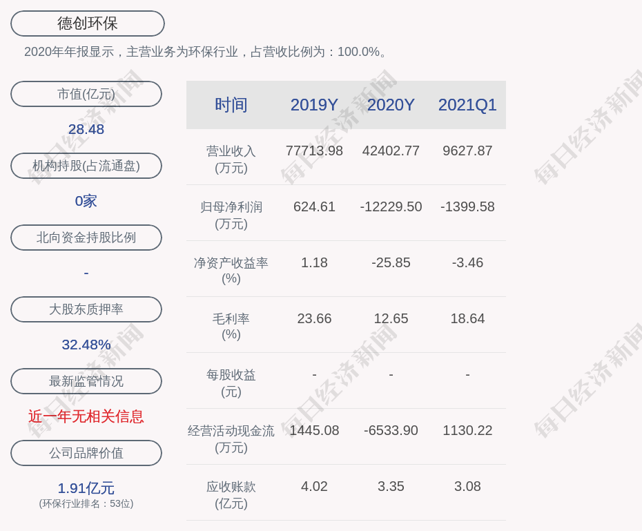 2020年年报显示,德创环保的主营业务为环保行业,占营收比例为:100.0%。