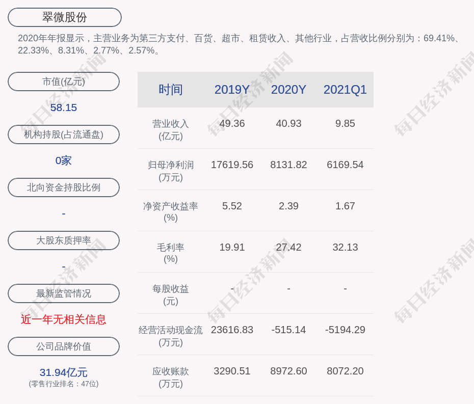 2020年年报显示,翠微股份的主营业务为第三方支付、百货、超市、租赁收入、其他行业,占营收比例分别为:69.41%、22.33%、8.31%、2.77%、2.57%。
