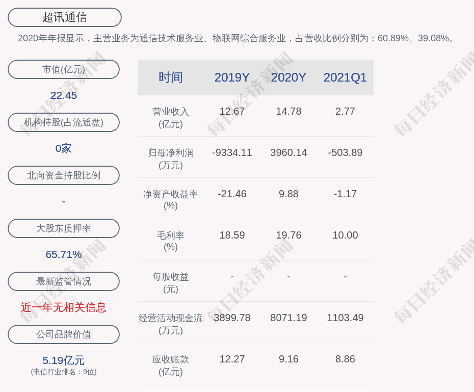 2020年年报显示,超讯通信的主营业务为通信技术服务业、物联网综合服务业,占营收比例分别为:60.89%、39.08%。