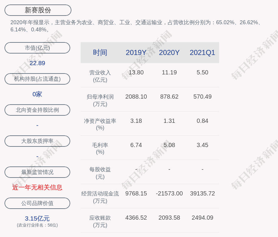 2020年年报显示,新赛股份的主营业务为农业、商贸业、工业、交通运输业,占营收比例分别为:65.02%、26.62%、6.14%、0.48%。