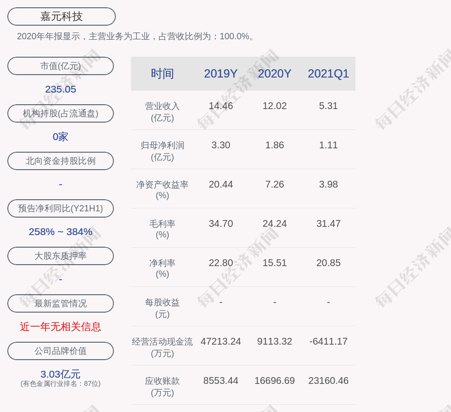 2020年年报显示,嘉元科技的主营业务为工业,占营收比例为:100.0%。