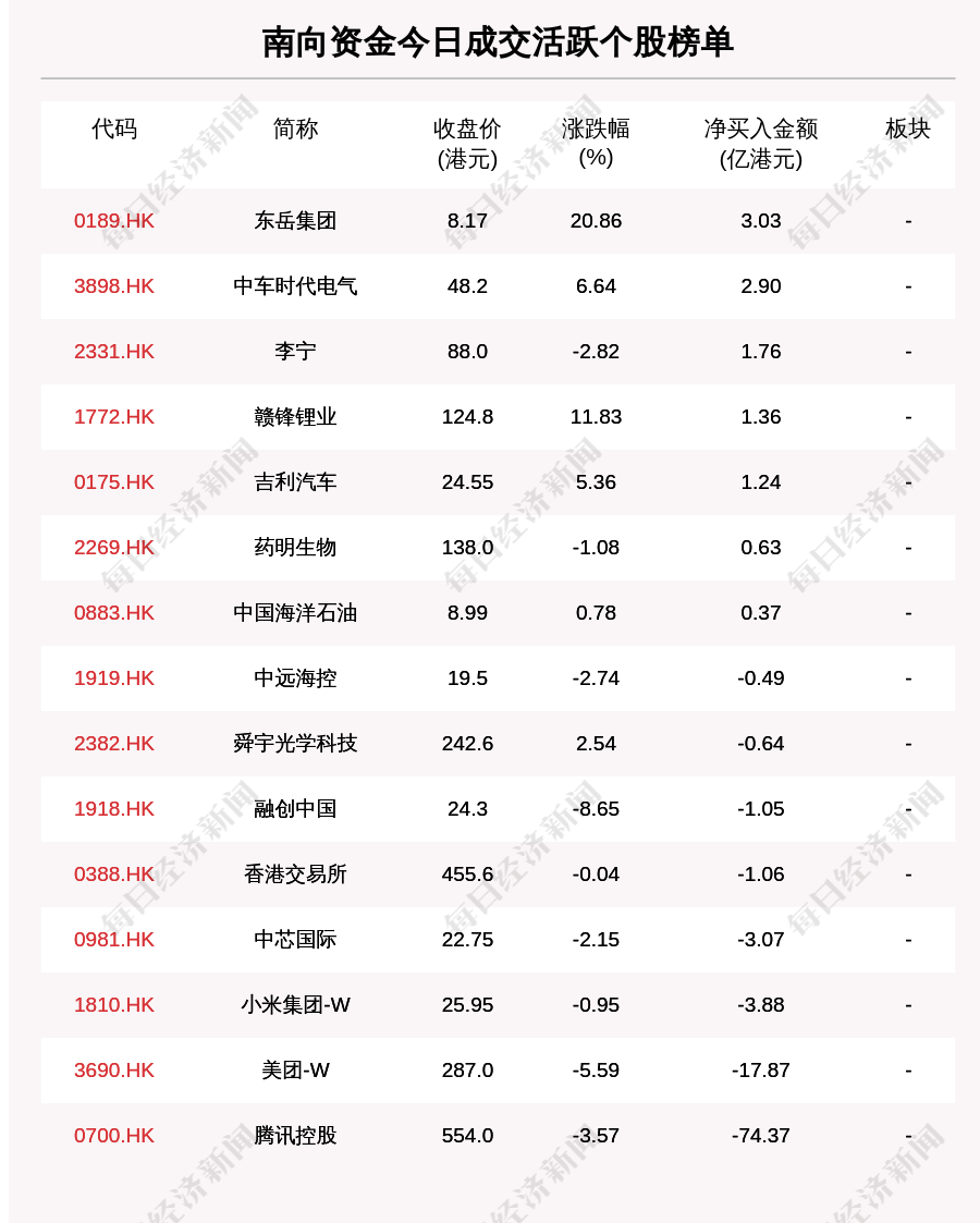 7月5日,南向资金成交活跃个股榜单中,净买入个股共7只,金额最多的是东岳集团(0189.HK,收盘价:8.17港元),净买入3.027亿港元;净卖出个股共8只,金额最多的是腾讯控股(0700.HK,收盘价:554.0港元),净卖出74.370亿港元。
