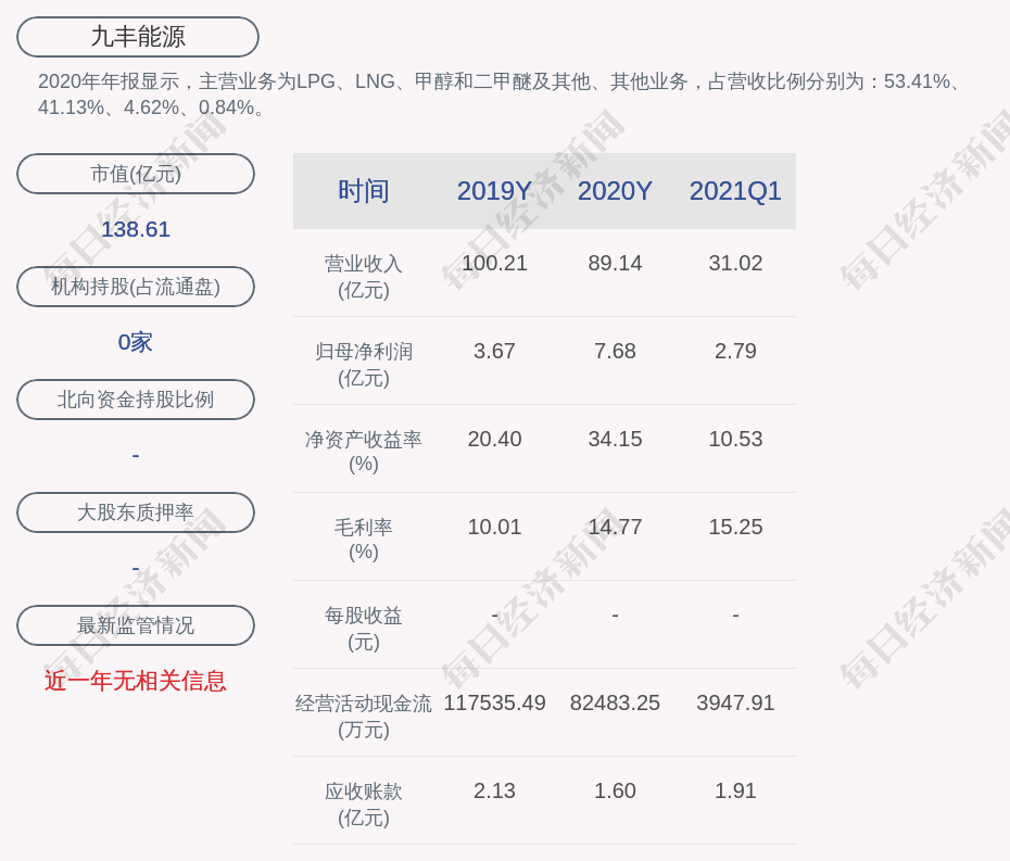 2020年年报显示,九丰能源的主营业务为LPG、LNG、甲醇和二甲醚及其他、其他业务,占营收比例分别为:53.41%、41.13%、4.62%、0.84%。