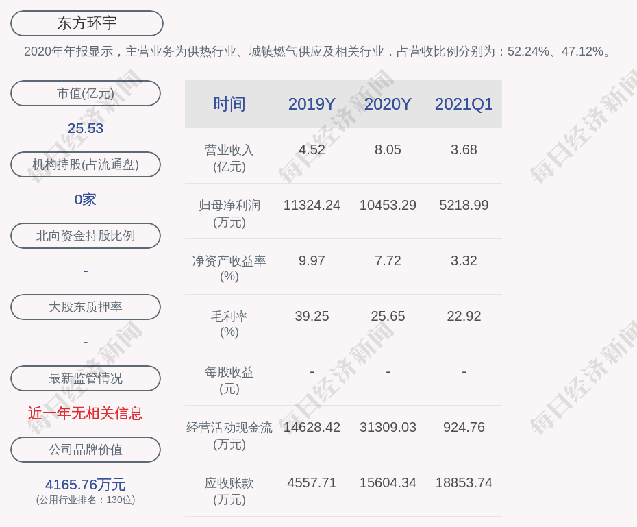 2020年年报显示,东方环宇的主营业务为供热行业、城镇燃气供应及相关行业,占营收比例分别为:52.24%、47.12%。