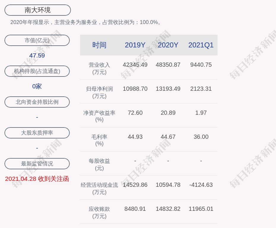 2020年年报显示,南大环境的主营业务为服务业,占营收比例为:100.0%。