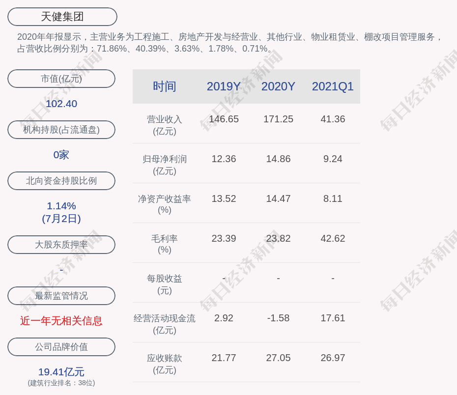 2020年年报显示,天健集团的主营业务为工程施工、房地产开发与经营业、其他行业、物业租赁业、棚改项目管理服务,占营收比例分别为:71.86%、40.39%、3.63%、1.78%、0.71%。