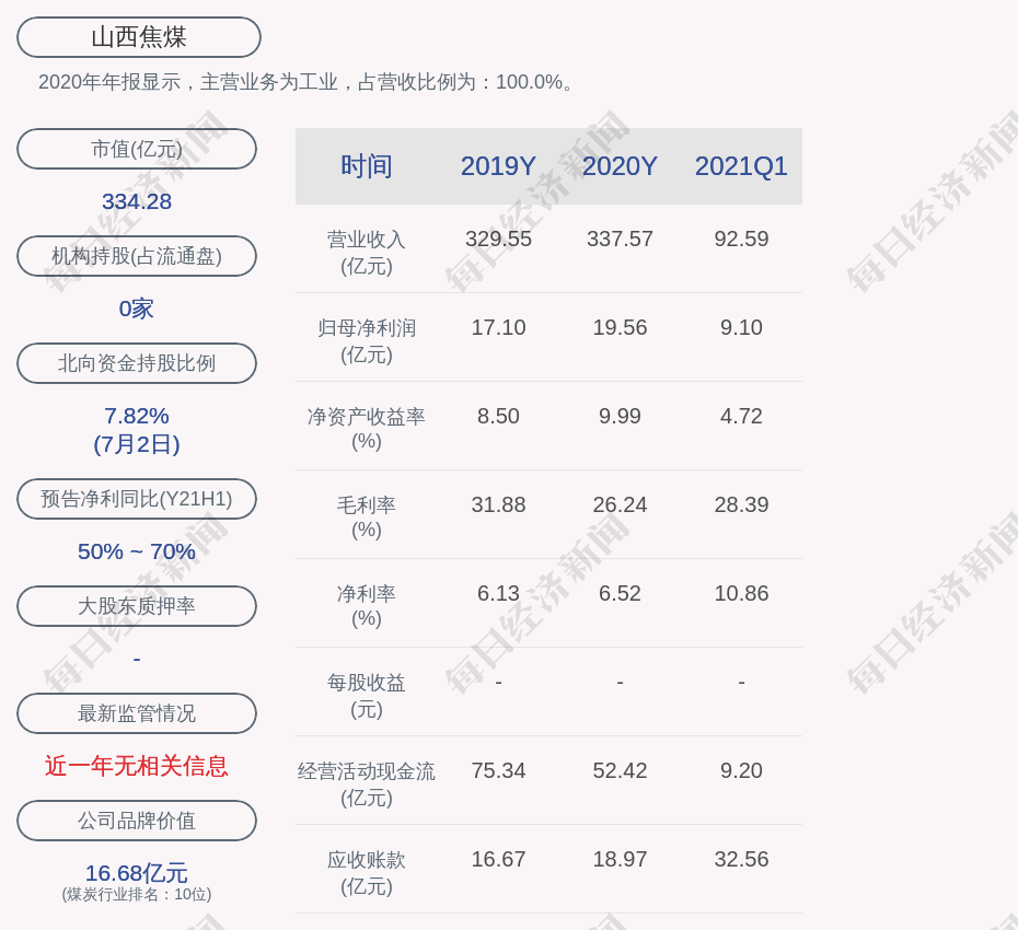 2020年年报显示,山西焦煤的主营业务为工业,占营收比例为:100.0%。